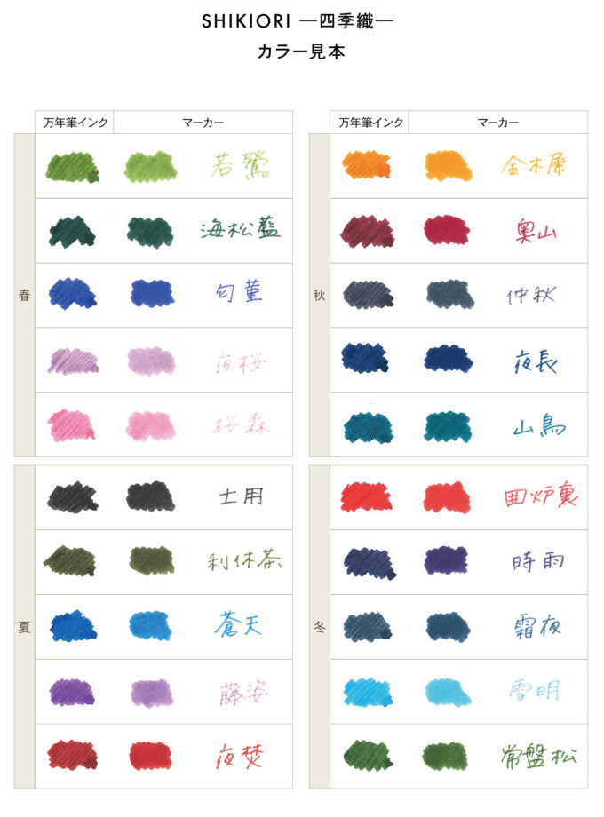 Note: These use water-based dye ink crafted to resemble SHIKIORI fountain pen ink hues; the formula is different from actual fountain pen ink.