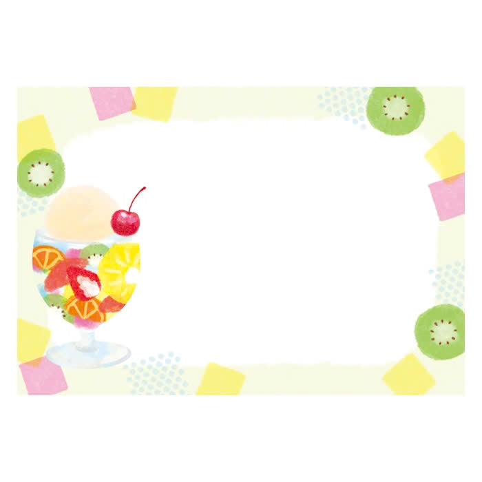 Colorful fruit-themed border with a glass of fruit juice and cherry on a white background
