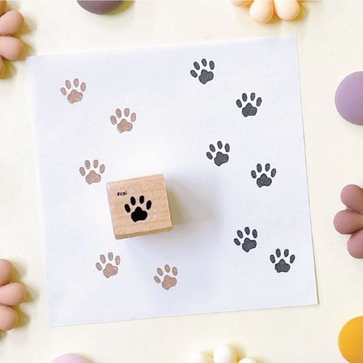 Wooden stamp with a paw print design on a white background