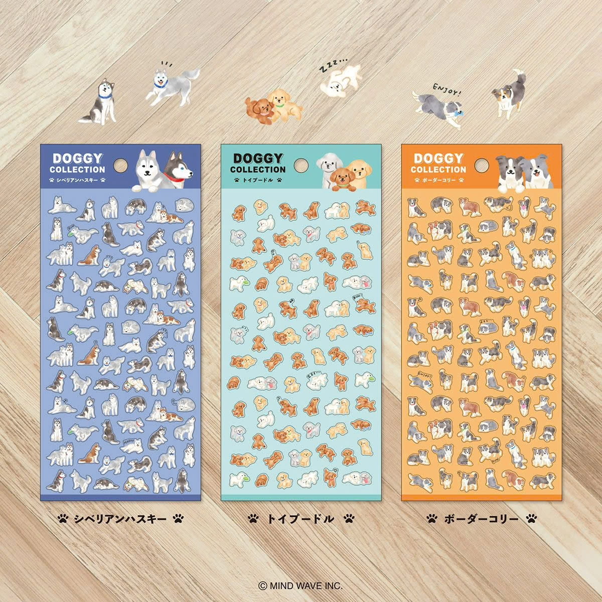 Doggy Collection sticker sheets on a wooden floor with small dog figurines.