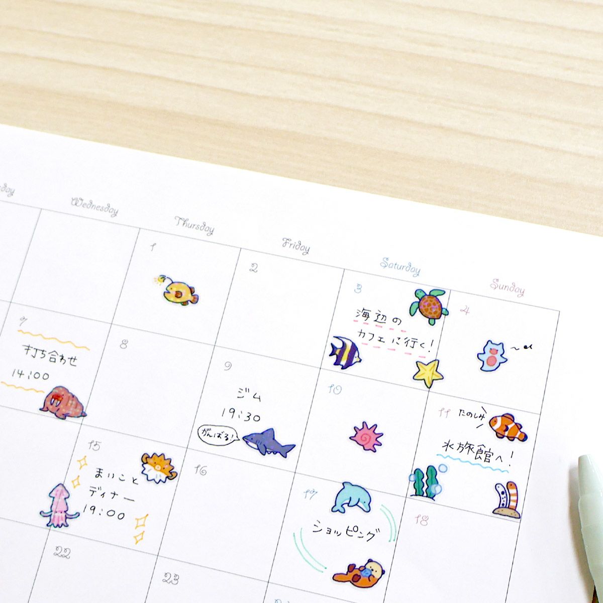 Calendar with cartoon sea creature stickers on a wooden surface