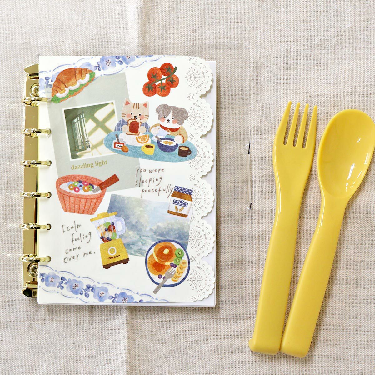 Notebook with decorative pages and yellow plastic fork and spoon on a textured surface