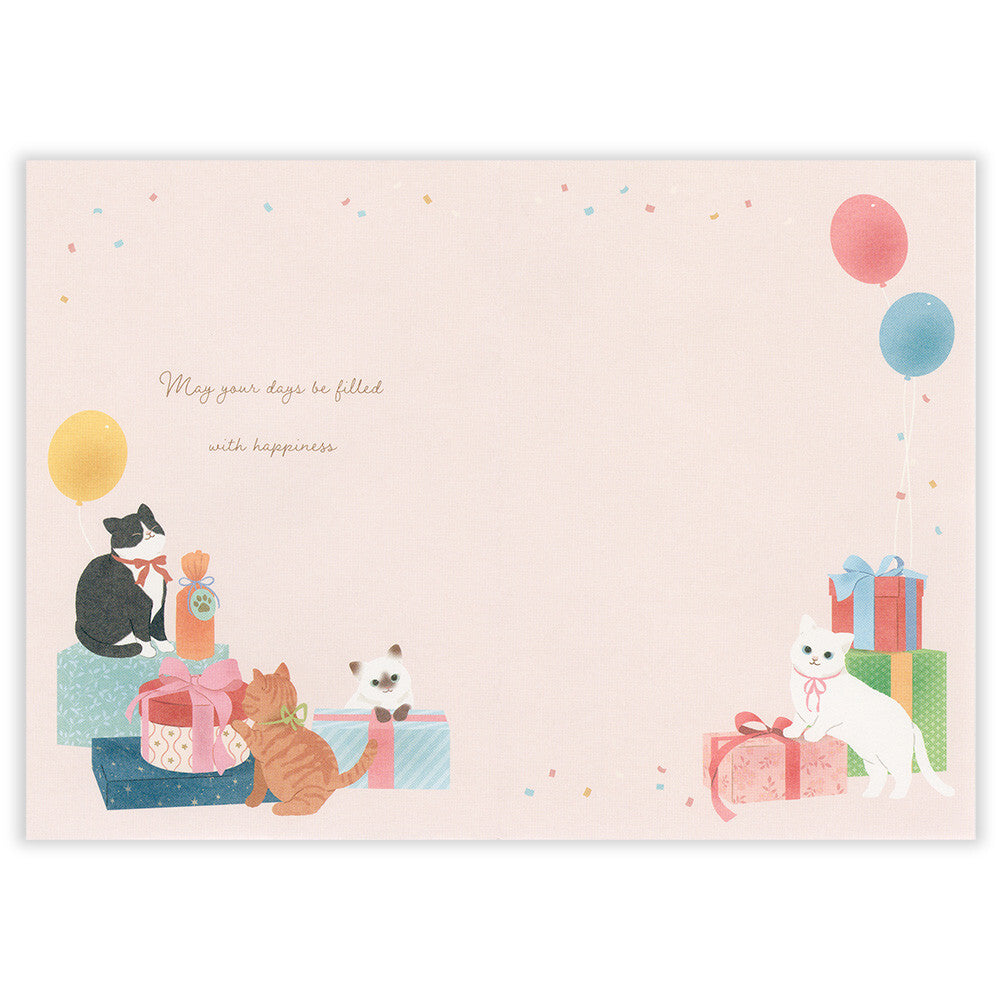 Card with illustrations of cats and balloons on a light pink background