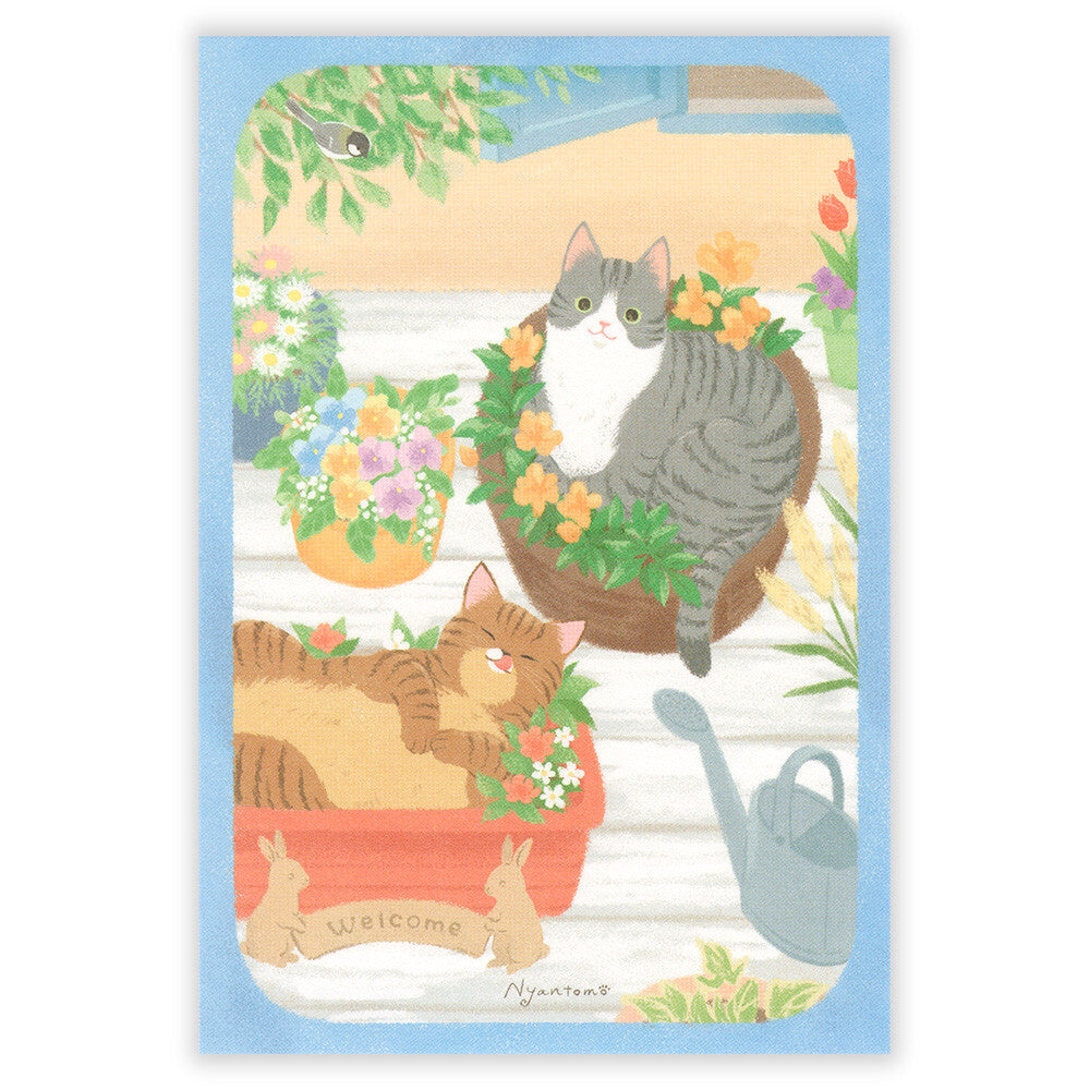 Illustration of two cats in a garden with flowers and a watering can.