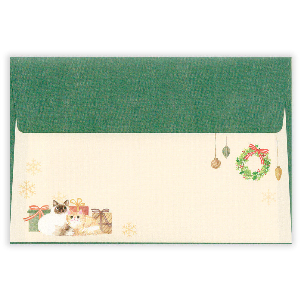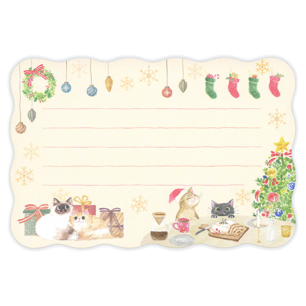 Christmas-themed stationery set with cats, tree, and wreath on a beige background