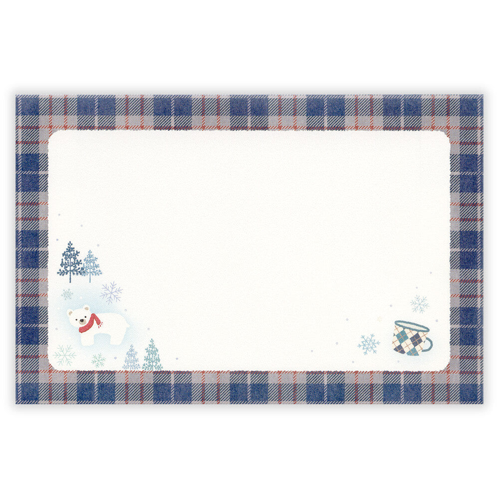 Set of stationery items with plaid designs and winter-themed illustrations on a white background