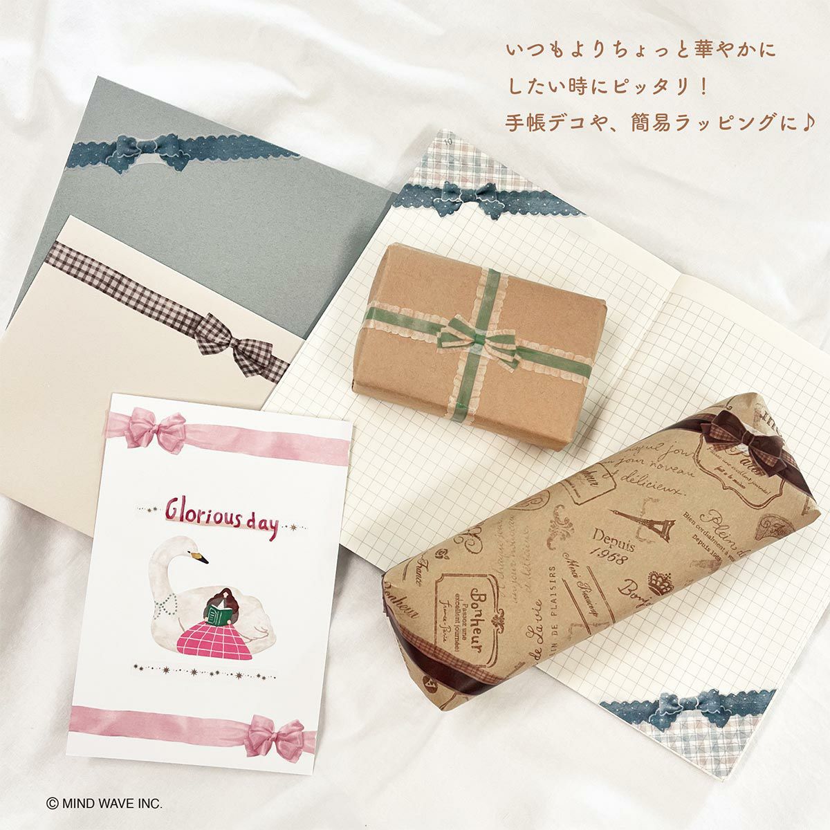Masking tape with decorative ribbons and packaging on a white background