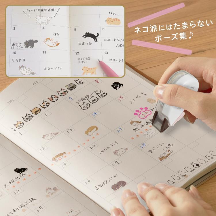 Hand using a stamp to create cat-themed designs on a paper with a calendar layout.