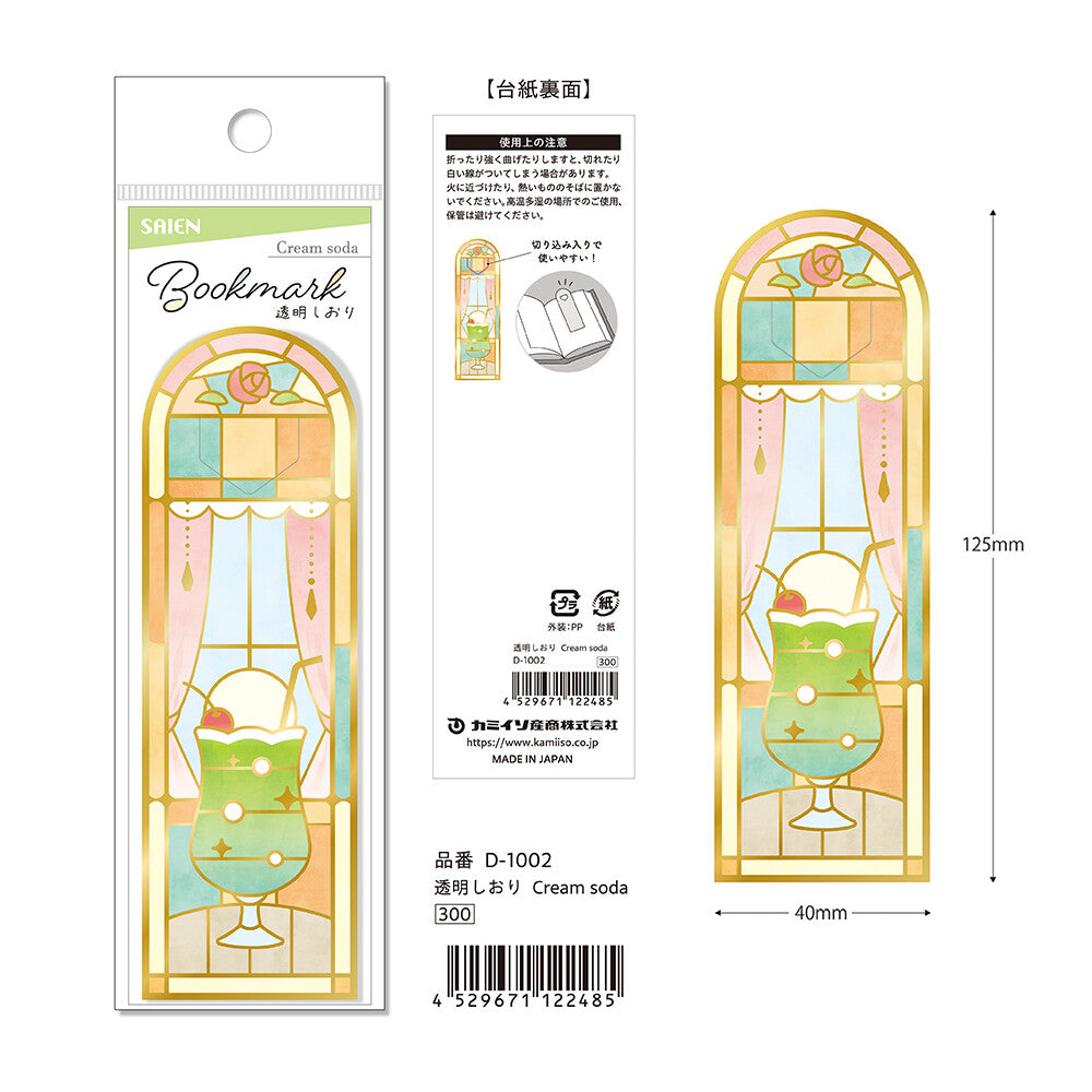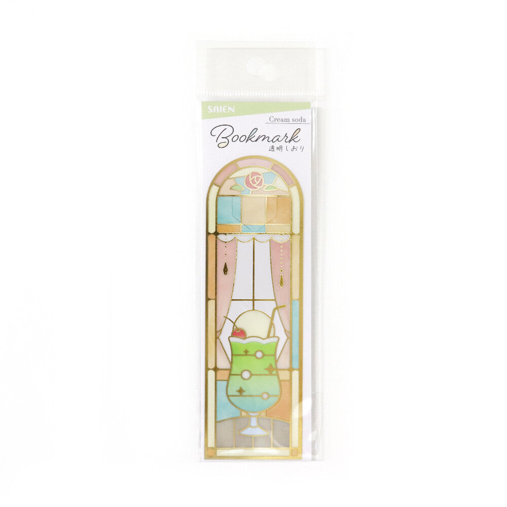 Bookmark with stained glass design and cream soda illustration, packaging shown.